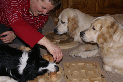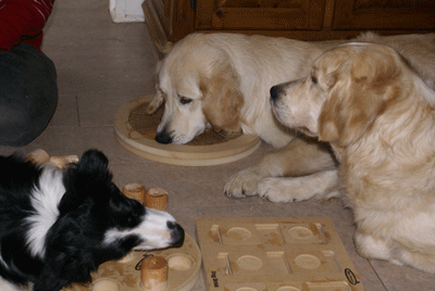 De honden moeten vakjes openen om bij een beloning te komen. Het nadeel van het speelgoed is, dat als ze eenmaal weten wat ze moeten doen, het voor hen geen uitdaging meer is. Natuurlijk blijven ze wel enthousiast, er zijn tenslotte koekjes te vinden.