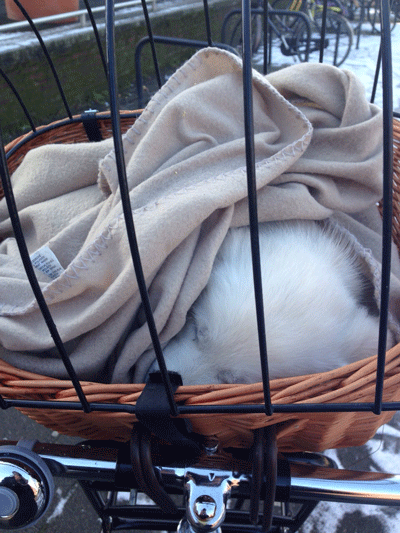 Lekker slapen in de fietsmand. Rennen in het bos, de sneeuw was wel koud.