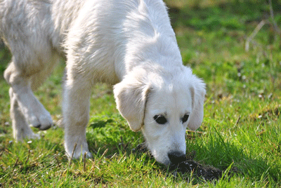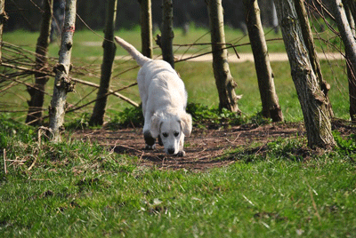 Ook gras plukken en blaadjes van takken ritsen is geweldig. Tijdens wandelingen verzamelt ze graag stokken en stenen om die vervolgens zo ver mogelijk mee te dragen. Los lopen doet ze geweldig, als je de riem loskoppelt gaat er echt een knop om. Ze houdt je heel goed in de gaten en kijkt je bij alles wat ze wil doen aan om toestemming te vragen. Alhoewel, als ze een duif of eend ziet moppert ze eerst wel even voordat ze terug komt, want dat is toch wel helemaal het einde! Het is heerlijk om zo in het bos te wandelen, waar we heen fietsen terwijl zij in het fietsmandje zit (dat past helaas eerdaags niet meer..). In het bos kan ze heerlijk rollen door de blaadjes en modder als een echte Bedrabbled. Het is echt heerlijk om samen met haar alle kleine paadjes van het bos te verkennen en al klimmend, klauterend en spelend (we hebben vaak een trektouw of balletje mee) door het bos te lopen. De tijd vliegt voorbij dan, ik kijk al erg uit naar het moment dat ze langer mag lopen!