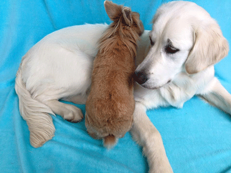 Bedrabbled Aiko doet het best goed op de jachttraining. Maar daarom kan ze toch ook lief zijn met het logeer-konijn.