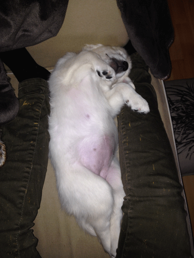 Het contact met andere honden gaat ook goed, al mag ze wel wat meer voor zichzelf opkomen. Ook bij pups die jonger zijn dan zij gedraagt ze zich heel onderdanig en laat ze zich makkelijk de kaas van haar brood eten. Wij baasjes moeten dus nog wel eens voor haar opkomen, maar ze geeft tegenwoordig goed aan als ze het niet meer leuk vindt en komt dan op onze voeten zitten.