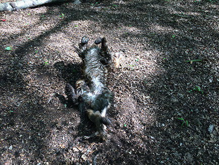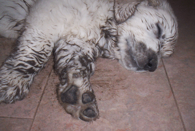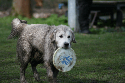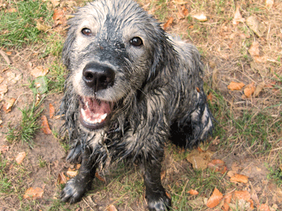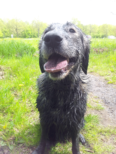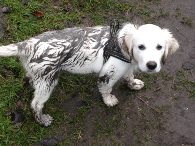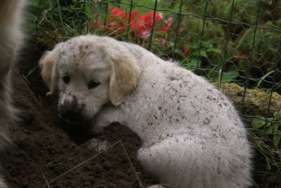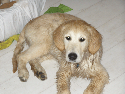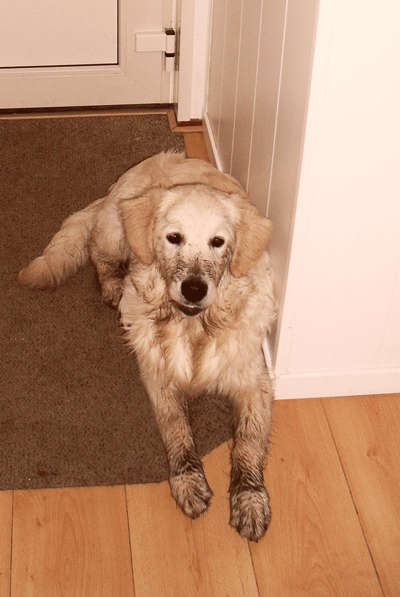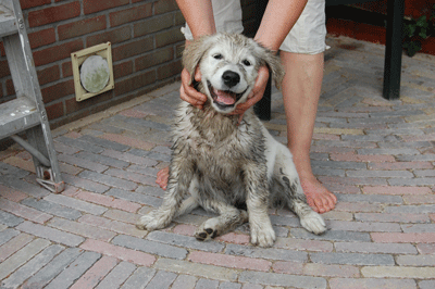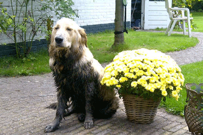 Toen wij in 2005 hadden besloten dat we het toch wel heel erg leuk zouden vinden om af een toe een nestje te fokken, moest er een passende kennelnaam komen. We vonden de naam al bladerend in een Wolters woordenboek engels. Het werd Bedrabbled. Het betekent nat en bemodderd. En dat Goldens graag bedrabbled zijn is een feit.