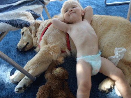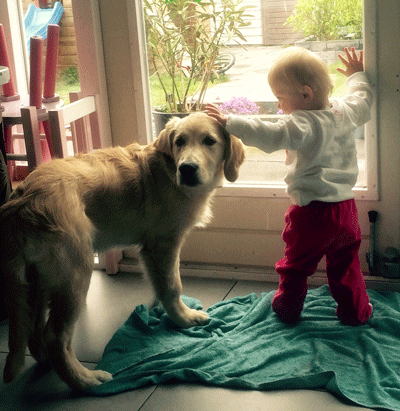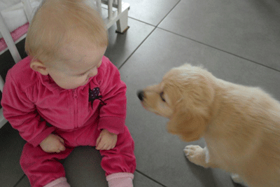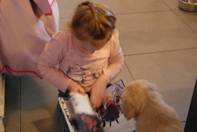Wat is Cooper een lieverd. Hij heeft zo nu en dan ook apenstreken hoor, maar hij is super lief ook voor de meiden. In het begin zag Cooper Sofie als een levend speeltje en andersom ook. Nu zijn ze zo schattig bij elkaar. Hij probeert echt heel zachtjes met haar te spelen. Met Esmée kan hij zich echt uitleven. Lekker rennen buiten. Beiden zijn dan heerlijk moe na het spelen. Iris is ons mamaatje, zorgt zowel voor Sofie als Cooper. Ze houdt precies in de gaten of hij nog drinken heeft, of dat hij met een speeltje vandoor gaat.