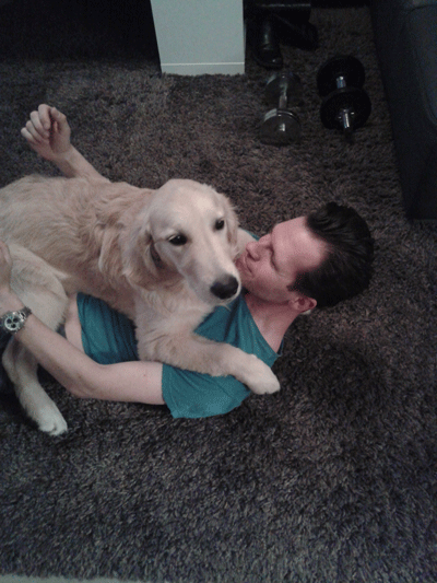Ook is Cooper heel sportief. Als de baas gaat sporten doet hij gezellig mee. Hij denkt af en toe dat baasje wat extra uitdaging nodig heeft en verzwaard de oefening door boven op de buik te liggen tijdens de sit-ups.