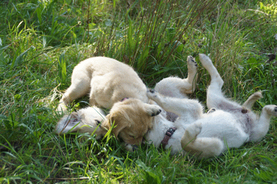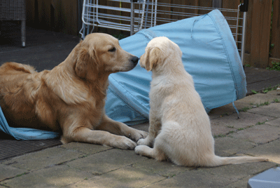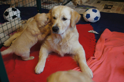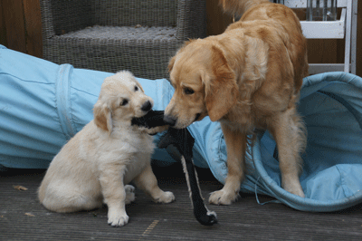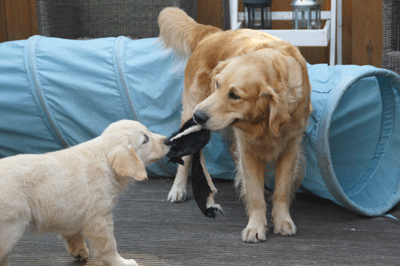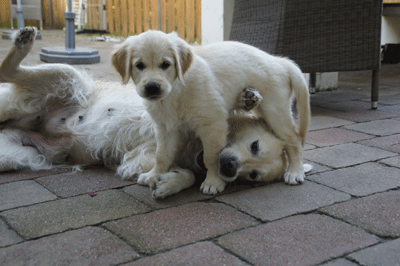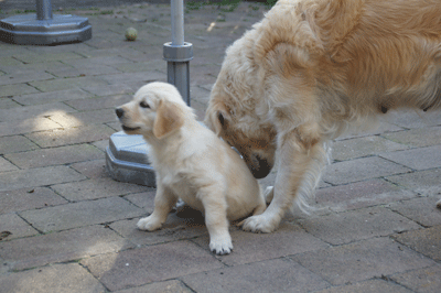 Cato speelt heel voorzichtig met een pup van Maartje