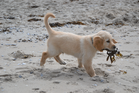 Vanaf dag twee steeds even naar het bos voor een korte wandeling en naarmate de weken verstreken steeds iets langer; later ook naar het strand voor een wandelingetje op het harde zand. Lekker struinen langs de vloedlijn en op zoek naar alles wat maar in z’n bek paste. Want Cooper houdt wel van vieze zaken zoals schapenkeutels, krabbenpootjes en zeewier! Het naar binnen werken van al die viezigheid proberen we natuurlijk zoveel mogelijk te voorkomen, maar dat lukt niet altijd.
