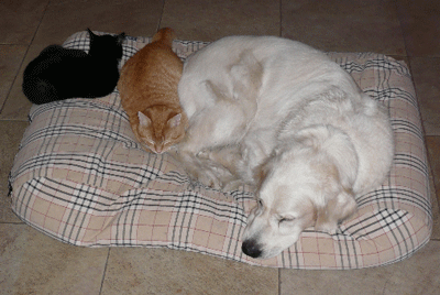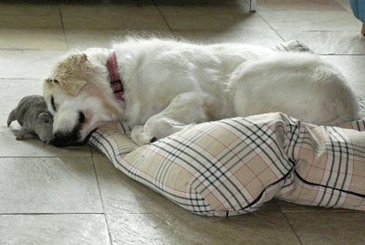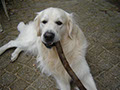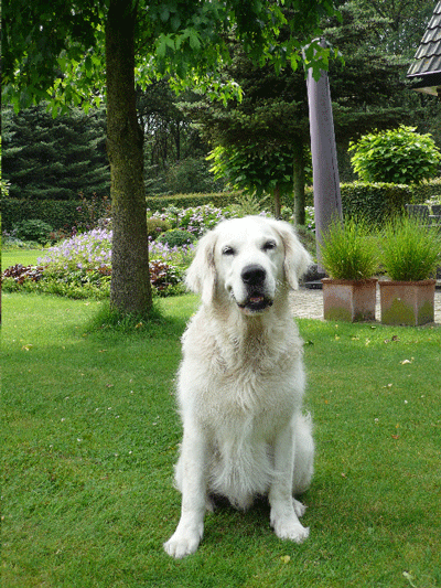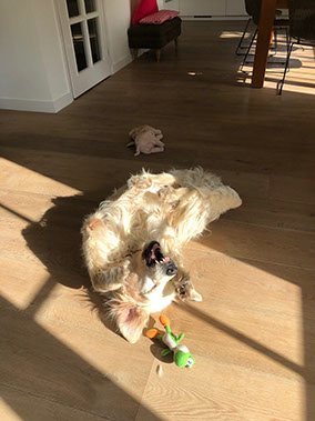 Toen ik bij mijn baasjes Marie José en Bob kwam, was ik heel ondeugend en druk. Ik geloof dat ze daar wel even aan moesten wennen. Maar nu willen ze me voor geen goud meer kwijt. Behalve mijn baasjes wonen er ook nog 3 katten in huis. De katten pikken vaak m’n kussen in en eerlijk gezegd durf ik daar niets tegen te doen.