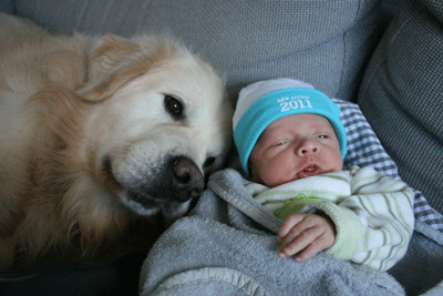 Eind november 2011 ging mijn vrouwtje plots weg voor een week. Ik snapte er niks van. Het baasje vertelde mij dat het vrouwtje in het ziekenhuis ligt omdat de baby 4 weken te vroeg is geboren en dat het vrouwtje snel naar huis komt. De week vloog maar langzaam voorbij. Toen het vrouwtje eindelijk thuiskwam, had ze iets vreemds bij zich, een maxi-cosi noemen ze het? Ik vond het kleine mannetje wat daarin lag in het begin wat eng, maar daarna besefte ik dat ik gewoon nog een baasje had waar ik eerdaags lekkere koekjes en knuffels van ga krijgen! Hier ben ik samen op de foto met het kleine mannetje. (Sem, geboren op 21-11-2011) Dikke vriendjes, nu al!