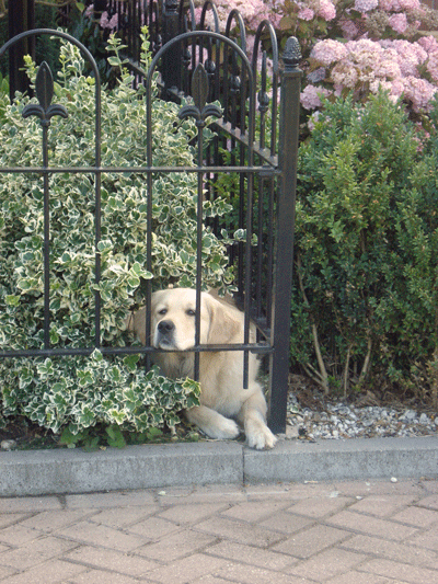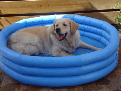 Als het heet weer is hebben we een badje in de achtertuin. Fleur ligt er natuurlijk steeds in. Haar favoriete plekje is toch nog steeds in de voortuin, daar kan ze alles lekker in de gaten houden. De buren hebben sinds 1 week een Berner Sennen pup en Fleur is er helemaal weg van.