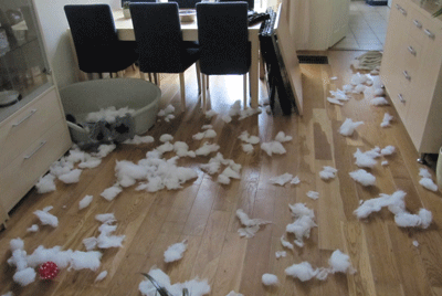 We gaan nog even naar het moment dat de pup mee naar huis gaat. Die pup is nog niet zindelijk. Dat moet je hem leren. Natuurlijk doe je er alles aan om hem zo snel mogelijk zindelijk te krijgen. Maar een ongeluk zit in een klein hoekje. Dit geld ook voor de hoekjes van de meubels waar wel eens een tandje in gaat. Ze kunnen ook wel eens slopen!!!!