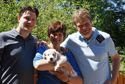 Op een mooie dag in juni was het zo ver. De nieuwe baasjes kwamen bij Anita en Marja in Beverwijk om hun pup op te halen. Het was erg gezellig met koffie en gebak. Alle pups werden “officieel” aan hun baasjes overgedragen en daarna ging ik met Hetty en Fred mee in de auto.