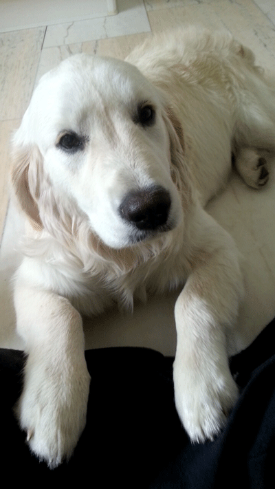 Het is een echte knuffel-hond! Zodra ze onze jongens hoort, gaan haar oren overeind (voor zover dat lukt haha) en kwispelt ze hard met haar staart!