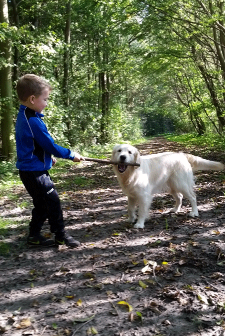 Verder zijn we van de zomer op vakantie geweest en is Senna uit logeren gegaan bij mijn schoonzus en haar hond Donna. Dit is heel goed gegaan, al waren wij wel heel erg blij om Senna na 10 dagen weer te zien. Senna is echt een verrijking van ons gezin, ze luistert heel goed. We lopen veel met haar door het bos, dat vind ze prachtig. In het bos rent ze als een malle alle kanten op. Ook gaat ze graag zwemmen, zodra ze water ziet wil ze erin. Ze is ook echt een ontzettende kroelkont, vooral de kindjes vinden dat prachtig.