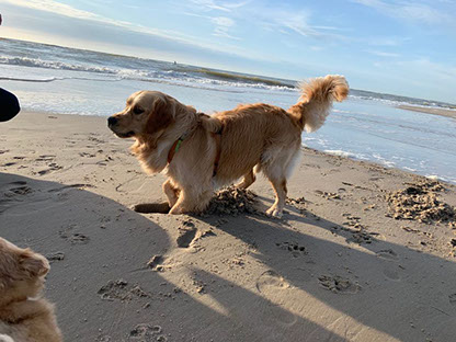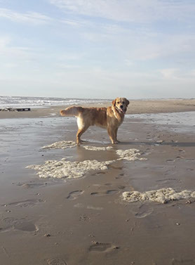 Op het strand ben ik ook heel graag, wat kun je daar een heerlijk eind in de rondte graven want zand in overvloed. Het water is toch best wel spannend nog steeds want dat komt telkens maar naar mij toe terwijl ik daar toch helemaal niet om vraag!! Maar ook daar kan ik heerlijk met mijn maatje wandelen en spelen.